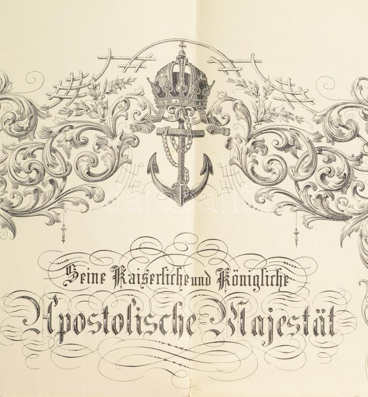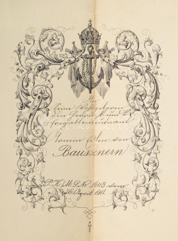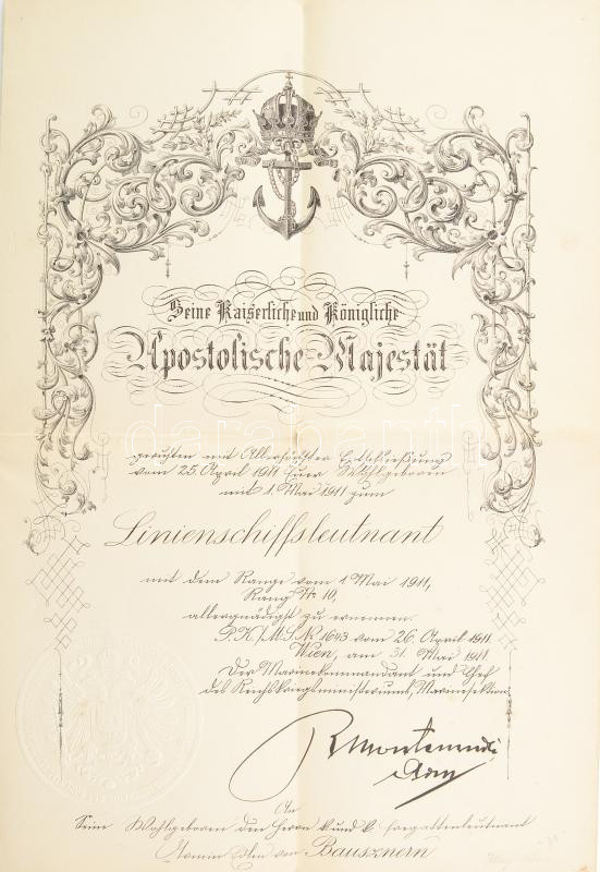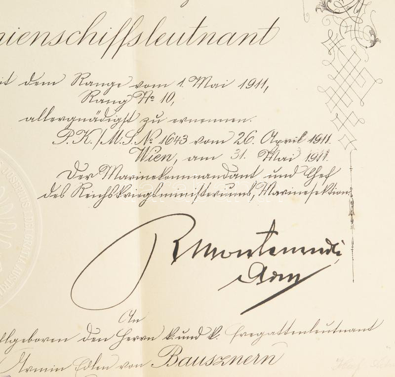 1911 Bausznern Ármin, az Osztrák-Magyar Cs. és Kir. Haditengerészet (K. u. k. Kriegsmarine) tisztjének sorhajóhadnagyi kinevezése (Linienschiffsleutnant). Rendkívül dekoratív, német nyelvű oklevél, szép állapotú szárazpecséttel, Rudolf von Montecuccoli (1843-1922), a Cs. és Kir. Haditengerészet főparancsnokának autográf aláírásával, 40x27 cm. [Bausznern Ármin, nemes (1881-1960), a fiumei Cs. és Kir. Haditengerészeti Akadémián végzett 1901-ben, ahol II. oszt. tengerész hadapróddá avatták. 1901 és 1918 között a Cs. és Kir. Haditengerészetnél szolgált; a Monarchia felbomlását követően a Dunai Flottillánál, majd a Tanácsköztársaság alatt a Vörös Hadsereg haditengerészeténél, ahol korvettkapitányi rangban vált ki a szolgálatból. 1929-től a M. Kir. Folyamőrségnél teljesített szolgálatot, 1937-től a Folyamőrség parancsnokhelyettese, majd parancsnoka. 1940-ben vonult nyugállományba, ugyanebben az évben c. vezérkapitányi ranggal tüntették ki.] // 1911 Austro-Hungarian Navy (K. u. k. Kriegsmarine), lieutenant's appointment (Linienschiffsleutnant), decorative certificate with dry seal, in good condition, signed by the chief of the Austro-Hungarian Navy, Rudolf Montecuccoli (1843-1922).