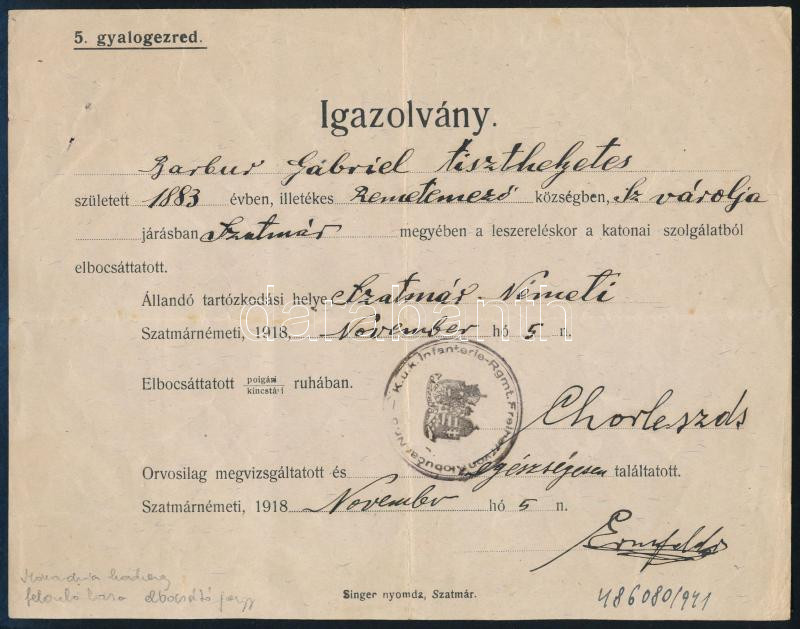 Beschreibung: 1918 Szatmárnémeti, igazolvány, katonai elbocsátójegy