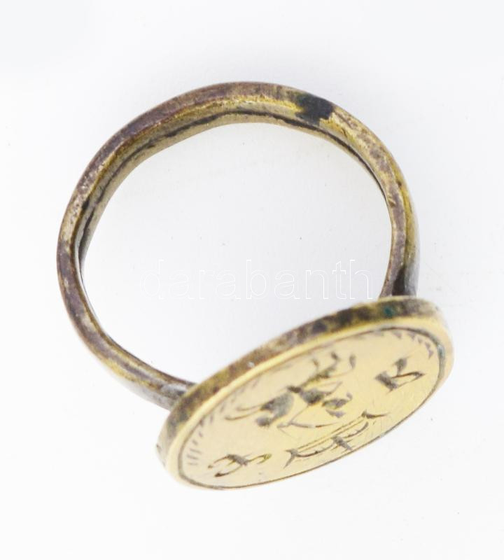 Beschreibung: cca XVIII. sz., katonai bronz pecsétgyűrű, lovas huszár ábrázolással, koronával és monogrammal, 23x19 mm, m: 58