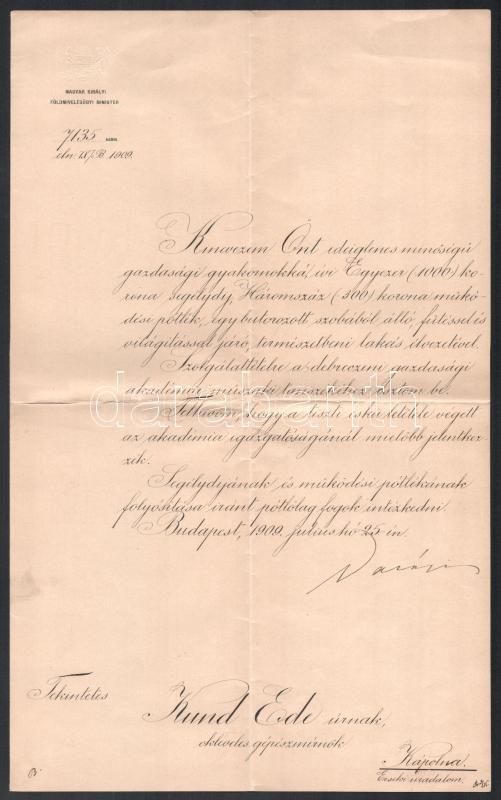 Beschreibung: 1909 Darányi Ignác (1849-1927) földművelésügyi miniszter aláírásával ellátott hivatalos levél fejléces levélpapíron