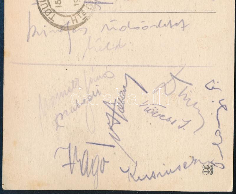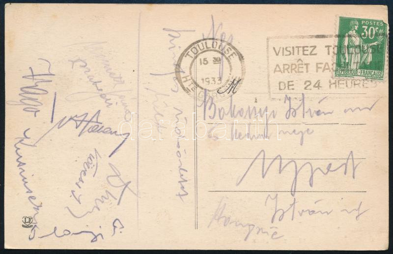1933 Az UTE vízilabdacsapat által aláírt képeslap Franciaországból, az akkor magyar válogatott tagjaival: Halassy, Vágó, Németh János, Köves Imre, Szigeti, stb / Autograph signatures of the Hungarian waterpolo team