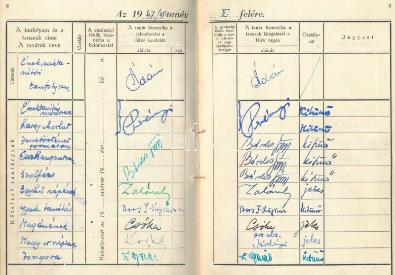 1947 Zeneművészeti Főiskola leckekönyv, benne Kodály Zoltán két autográf aláírása valamint Bárdos György, Csóka, Perényi, Ádám Jenő, stb / Autograph signatures of composers in an university grade book. ,