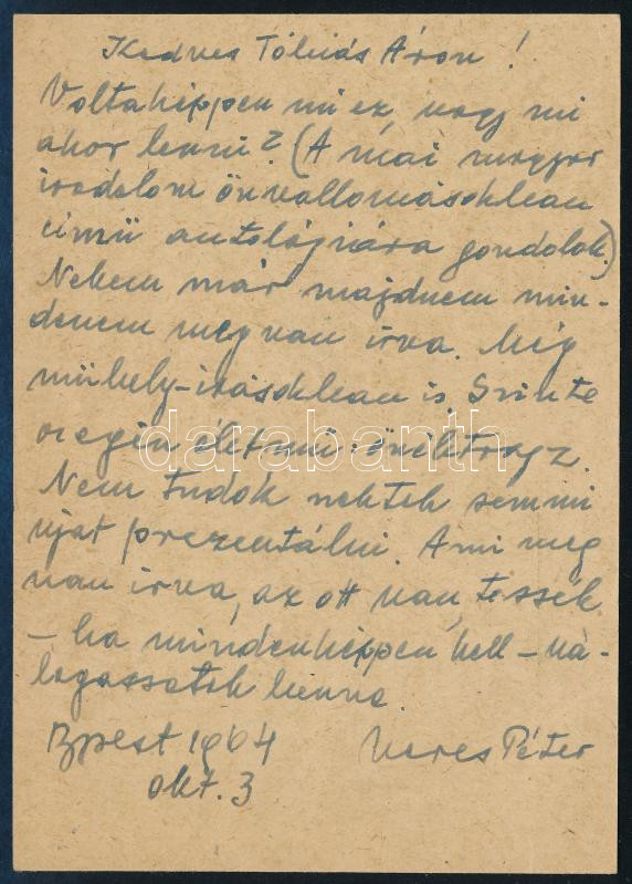 1964 Veres Péter (1897-1970) író által írt levelezőlap https://www.darabanth.com/de/43-Gross-Auktion/43.1/Kunst-Skulpturen-Historische-Dokumenten-andere-Sammelgebiete/Signatur~17556/1964-Veres-Peter-1897-1970-iro-altal-irt-levelezolap~II3228785