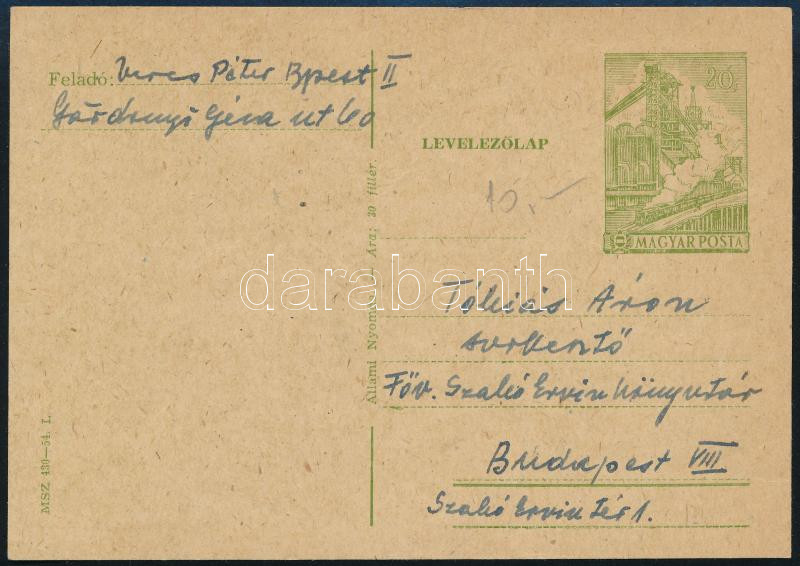 Beschreibung: 1964 Veres Péter (1897-1970) író által írt levelezőlap