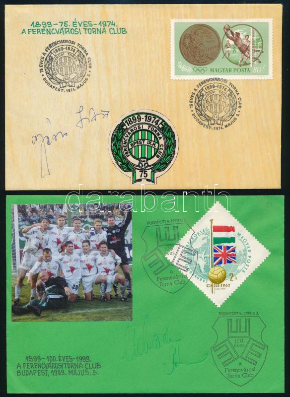Beschreibung: 1974-1999 75-100 éves a Ferencvárosi Torna Club alkalmi borítékok Albert Flórián és Géczi István labdarúgók aláírásával.