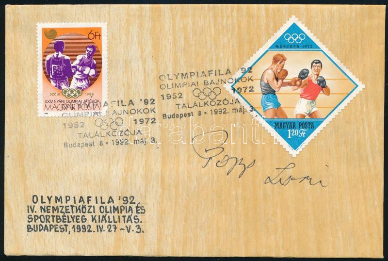 Beschreibung: 1992 Papp László (Papp Laci) olimpiai bajnok ökölvívó aláírása Olympiafila '92. IV. Nemzetközi Olimpia és Sportbélyeg Kiállítás Budapest FDC-n.