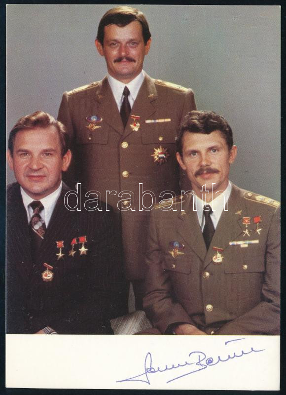 Farkas Bertalan (1949-) űrhajós autográf aláírása őt (illetve Magyari Bélát és Valerij Kubaszovot) ábrázoló fotón. /Autograph signature of Bertalan Farkas, the first Hungarian astronaut