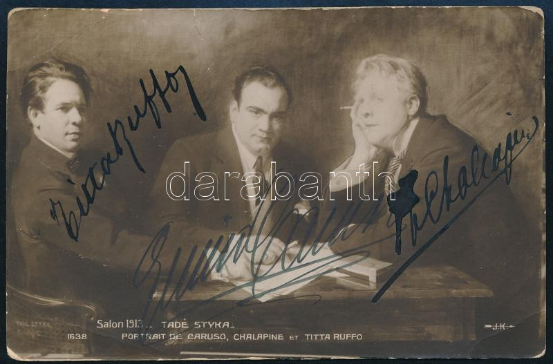 cca 1910 Enrico Caruso (1873-1921), Titta Ruffo (1877-1953), olasz és Feodor Chaliapin (1873-1938) orosz operaénekesek autográf aláírásai ő magukat ábrázoló festményről készült képeslapon / Autograph signatures of Italian and Russian opera singers Enrico Caruso (1873-1921), Titta Ruffo (1877-1953) and Feodor Chaliapin (1873-1938) on a postcard made from a painting of themselves
