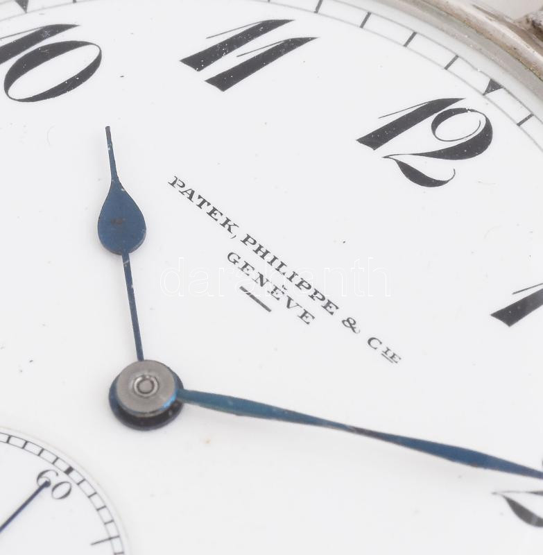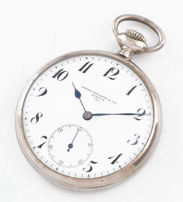 Patek Philippe nyitott zsebóra jelzett számlap, jelzett szerkezet, szerkezetszám: 170030. Későbbi fém tokban. Működő, jó állapotban. d: 45 mm. / Patek Philippe open pocket watch marked dial, marked movement, movement number: 170030. In later metal case. Working, in good condition. d: 45 mm