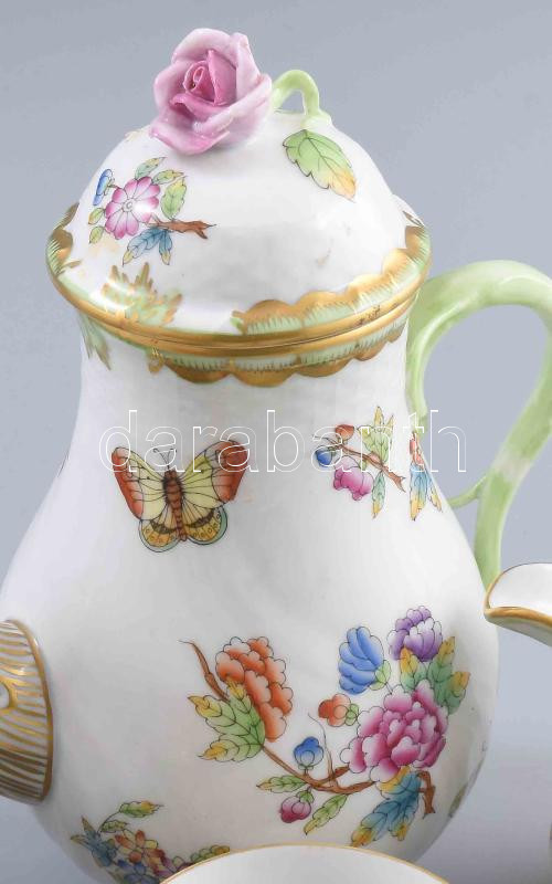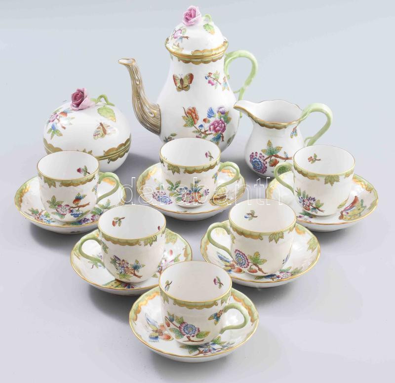 Herendi Viktória mintás mokkás készlet hat személyes . Jelzett, kézzel festett, hibátlan, teljes./// Herend Victoria-patterned mocha set for six persons. Signed, hand-painted, flawless, complete.