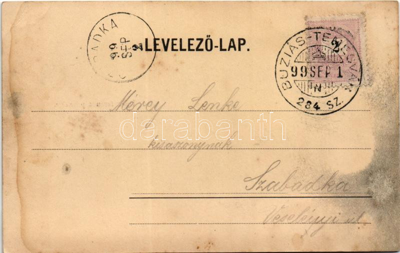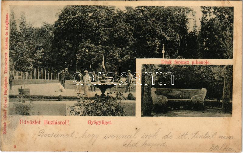 1899 (Vorläufer) Buziás, Buziásfürdő, Baile Buzias; Gyógyliget, Deák Ferenc pihenője. Kossak József udvari fényképész kiadása / spa, park + "BUZIÁS - TEMESVÁR 284. SZ." vasúti mozgóposta bélyegző (r)