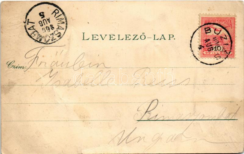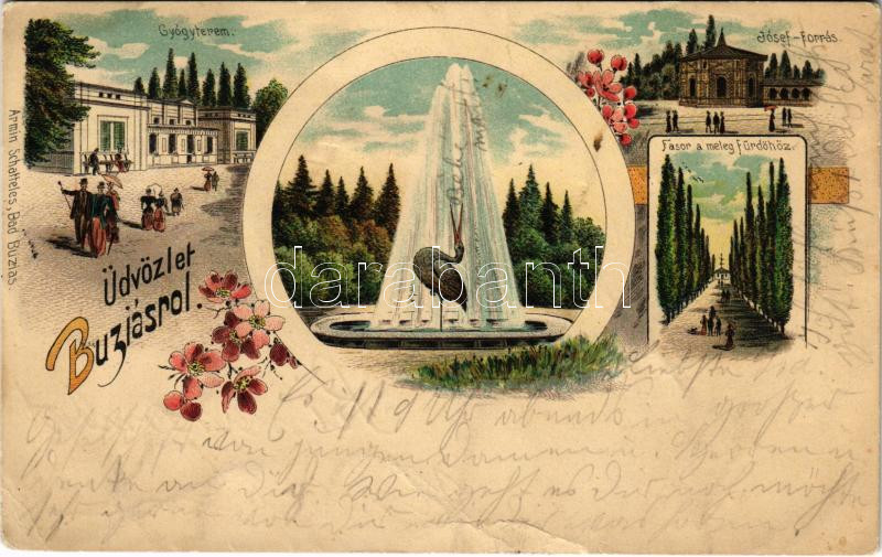 1900 Buziás, Buziásfürdő, Baile Buzias; Gyógyterem, József-forrás, szökőkút, Fasor a meleg fürdőhöz. Armin Schatteles kiadása / spa, bath, spring source, fountain. Art Nouveau, floral, litho (fa)