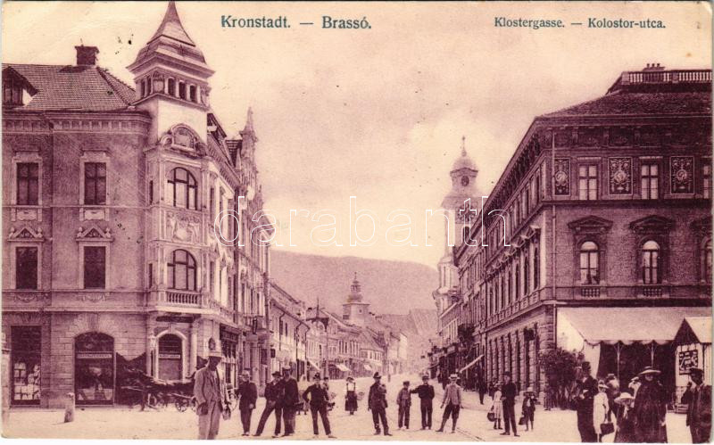 1908 Brassó, Kronstadt, Brasov; Klostergasse / Kolostor utca, üzletek ... https://www.darabanth.com/de/430-Fernauktion/430.0/Ansichtskarten/Siebenburgen~1500005/1908-Brasso-Kronstadt-Brasov-Klostergasse-Kolostor-utca-uzletek-street-view-shops-EB~II2761210