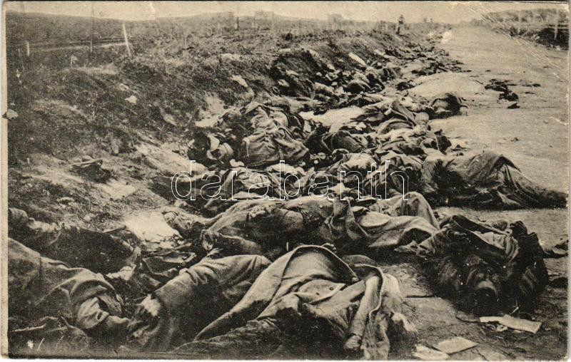 1916 Brassó, Kronstadt, Brasov; Die Befreiung Kronstadts, Rum. Toten Schwarmlinie bei Bartholomä / Csapataink bevonulása Brassóba. Brassó-Bertalani román halott rajvonal. Adler & Sohn / WWI Austro-Hungarian military, entry of the K.u.K. troops into Brasov. Corpses of dead Romanian soldiers between the railway stations of Bartolomeu and Brasov (fa)