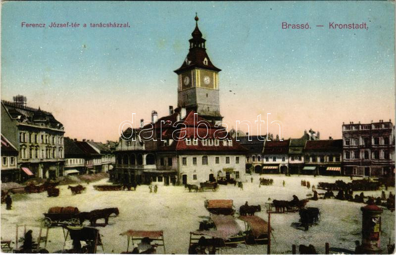 Brassó, Kronstadt, Brasov; Ferenc József tér, Tanácsház (városháza), piac, építkezés, üzletek / square, town hall, market, construction, shops