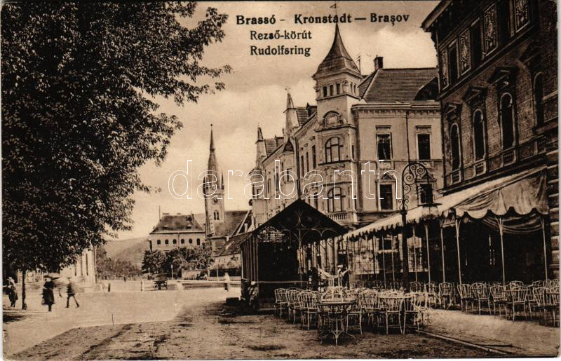 Brassó, Kronstadt, Brasov; Rezső körút, kávéház / Rudolfsring / street... https://www.darabanth.com/de/430-Fernauktion/430.0/Ansichtskarten/Siebenburgen~1500005/Brasso-Kronstadt-Brasov-Rezso-korut-kavehaz-Rudolfsring-street-view-cafe~II2761201