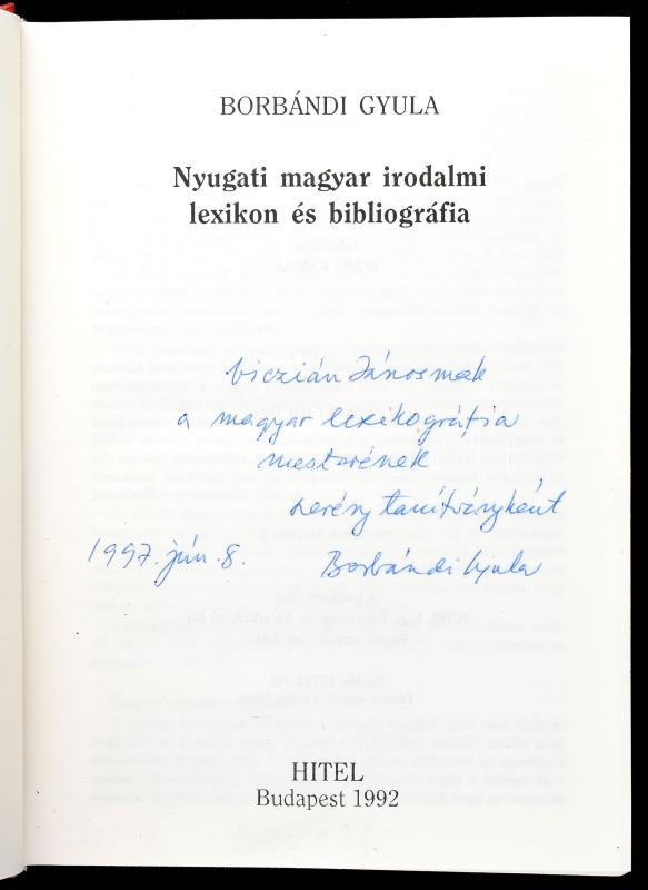 Borbándi Gyula: Nyugati magyar irodalmi lexikon és bibliográfia. Bp., 1992, Hitel. Kiadói egészvászon-kötés. A szerző, Borbándi Gyula (1919-2014) Széchenyi-díjas író, történész, szerkesztő, a magyar emigráció kiemelkedő alakja által Viczián János (1940-2013) bibliográfus, könyvtáros, lexikográfus részére DEDIKÁLT példány. Viczián János ex libris-szével.