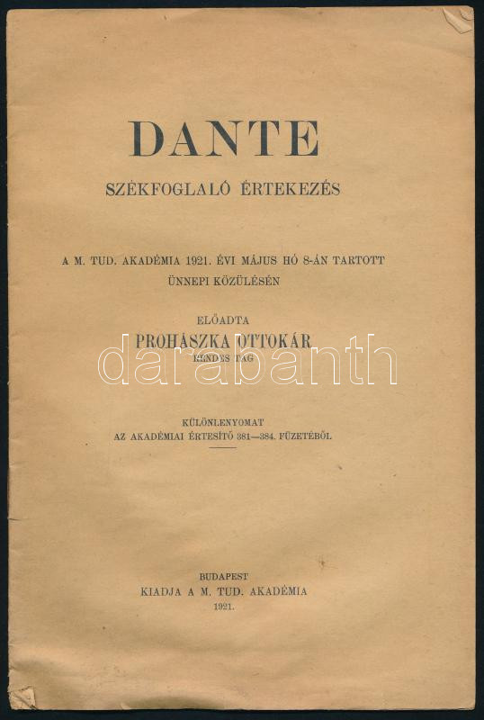 1921 Prohászka Ottokár: Dante. Székfoglaló értekezés. A M. Tud. Akadémia 1921. évi május hó 8-án tartott ünnepi közülésén előadta Prohászka Ottokár. Bp.,1921, M. Tud. Akadémia. 20 p. Kiadói papírkötés, kissé sérült borítóval.