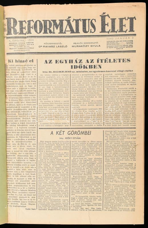 1943 Református Élet X. évf. 1-44. sz., 1943. jan. 2. - dec. 21. Szerk.: Dr. Ravasz László, Muraközy Gyula. (Teljes, vagy közel teljes évfolyam). Korabeli félvászon-kötésben, kissé sérült borítóval, néhány kissé sérült lappal.