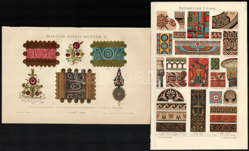 cca 1895-1900 kb. 40 db egyoldalas színes nyomat a Pallas Nagy Lexikonából (magyar díszítmények, ékítmények, flora, fauna stb.), néhány duplummal. Részben foltos. 24x16 cm