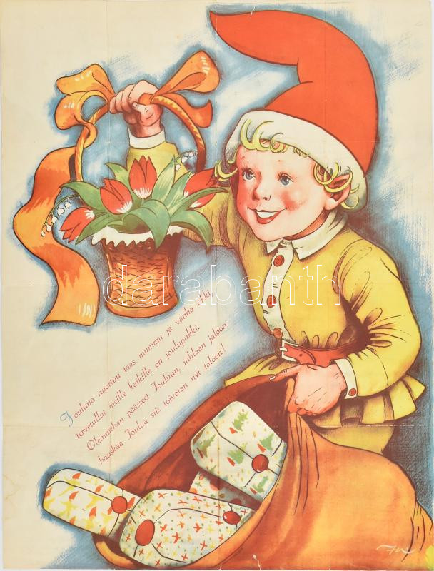 cca 1930-1940 Finn karácsonyi üdvözlőlap, plakátként kihajtható, rajta üdvözlő sorokkal, kis lapszéli szakadásokkal, foltokkal, 53,5x40,5 cm / Vintage Christmas greeting poster from Finland, with small tears and stains