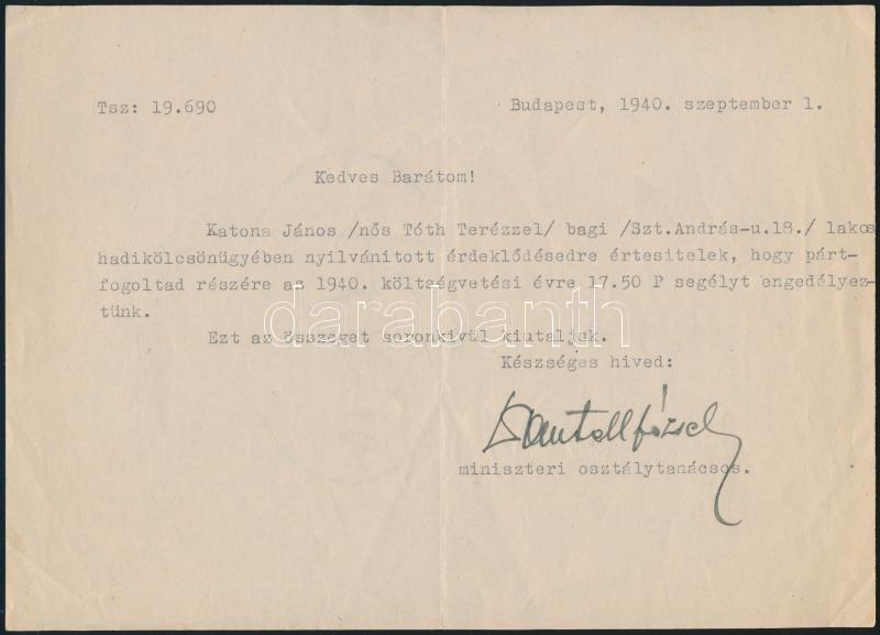 1940 id. Antall József (1896-1974) miniszteri osztálytanácsos gépelt, ... https://www.darabanth.com/de/430-Fernauktion/430.0/Kunst-Dokumente-andere-Sammelgebiete/Historische-Dokumenten-Handschriften~500021/1940-id-Antall-Jozsef-1896-1974-miniszteri-osztalytanacsos-gepelt-alairt-levele-hadikolcs~II2765263