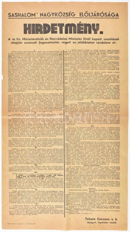 Beschreibung: 1944. ápr. 1., Sashalom, hirdetmény légoltalom ügyében a II. világháború idején, apró lapszéli sérülésekkel, hajtásnyomokkal, 60×31 cm.