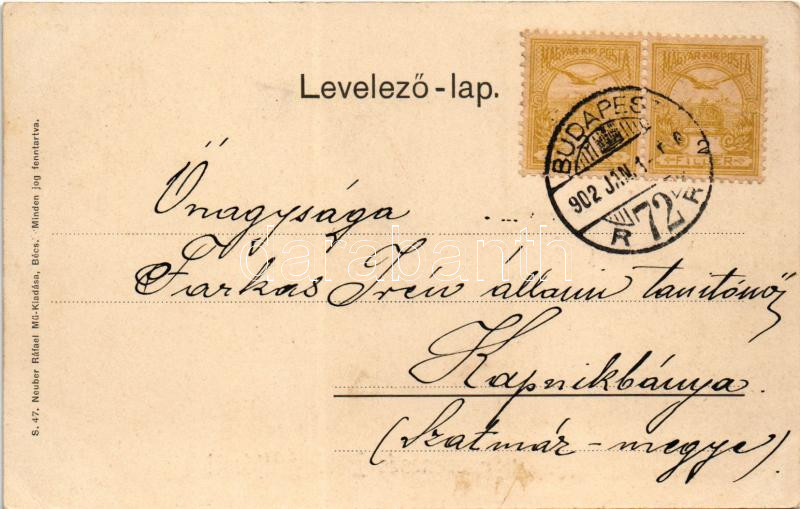 1902 Szerencsés Boldog Újévet! / New Year greeting art postcard, romantic couple, hunter with rifle. Kunstverlag Rafael Neuber Serie 47. litho s: E. Döcker jun. (EK)