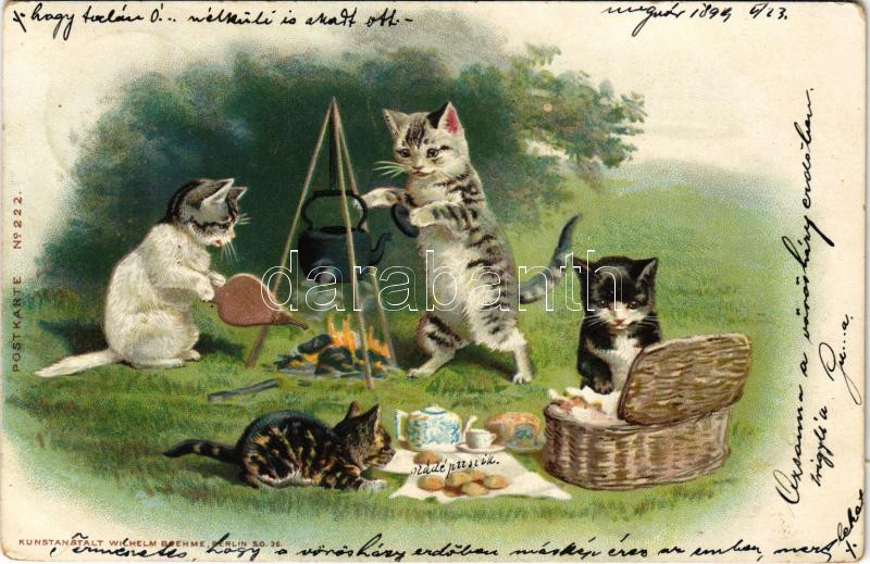 Beschreibung: 1899 (Vorläufer) Macska piknik / Cat picnic. Kunstanstalt Wilhelm Boehme Postkarte No. 222. litho (EK)