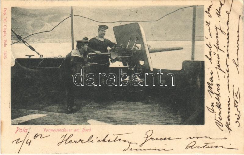 1902 Osztrák-magyar haditengerészet matrózai lőgyakorlat közben a fedélzeten, gépfegyver / K.u.k. Kriegsmarine Vormeisterfeuer am Bord / Austro-Hungarian Navy mariners' shooting practice on board, machine gun. M. Clapis Pola, 1605.