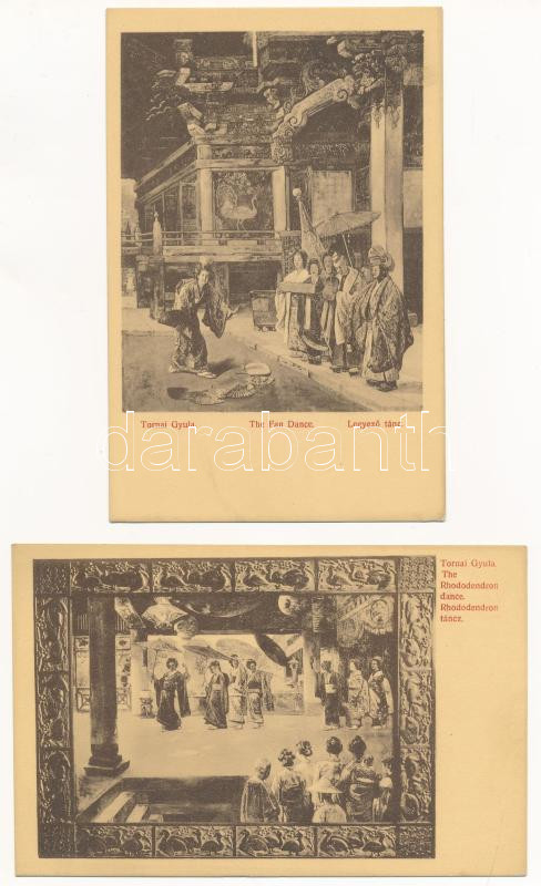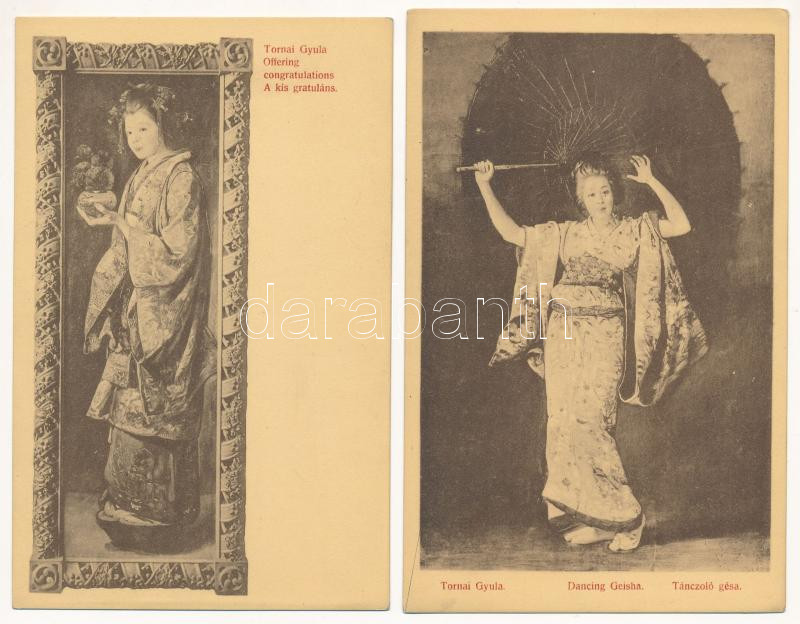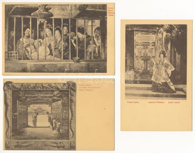 TORNAI GYULA (1861-1928) - 7 db régi japán gésákat ábrázoló képeslap Fischer és Teszák kiadásában. Magyarországon híres grafikus, festő és utazó 1905-ös utazásakor nagyon megkedvelte Japánt, ezért festett gésákat és egyéb életképeket. Münchentől Párizsig sok díjat nyertek képei