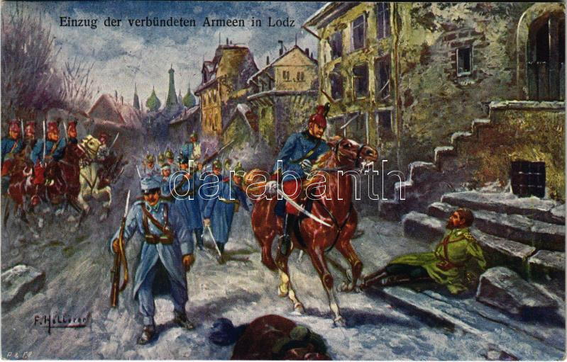 Beschreibung: 1915 A szövetséges hadtest bevonulása Lódz-ba / Einzug der verbündeten Armeen in Lodz / WWI K.u.K. military art postcard s: F. Höllerer
