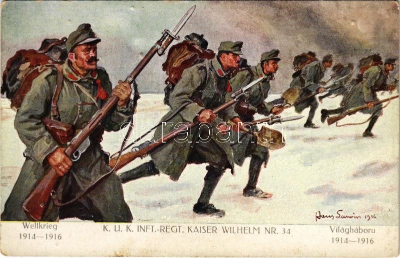 Weltkrieg 1914-1916 - K.u.K. Inft.-Regt. Kaiser Wilhelm Nr. 34. Verlag K.u.K. Kmdo. der 27. Inf. Trp. Dion. / WWI Austro-Hungarian military art postcard, 34th Infantry Regiment, support fund s: Hans Larwin (lyuk / pinhole)