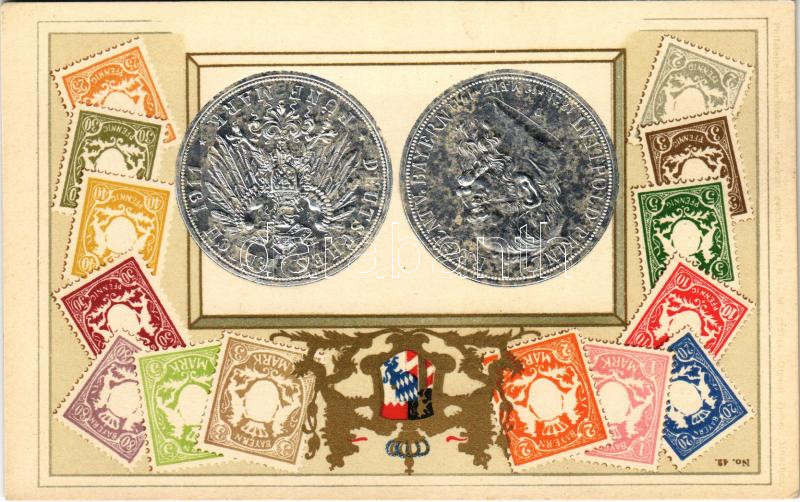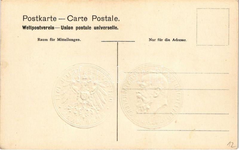 Beschreibung: 5 Márka - Német pénzérme és bélyegek. Dombornyomott / Fünf Mark - German coins and stamps. No. 42. Art Nouveau, embossed litho