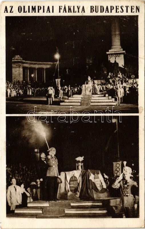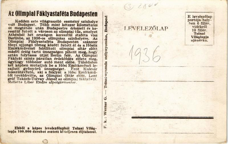 Budapest XIV. Az Olimpiai fáklyastaféta Budapesten. Az 1936-os berlini olimpia, Gróf Takách-Tolvay József és Liber Endre alpolgármester. Tolnai Világlapja 100.000 darabot osztott ki teljesen díjtalanul (fa)