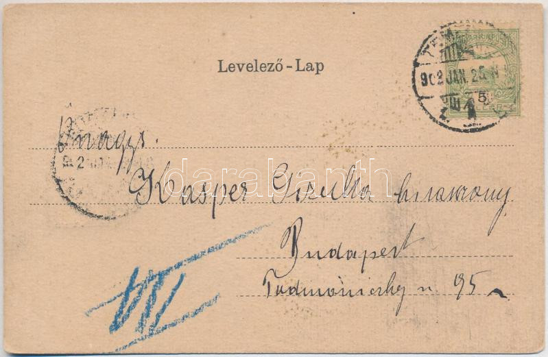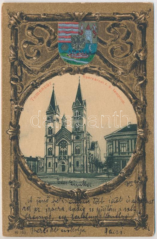 1902 Temesvár, Timisoara; Domtér, Gyárvárosi római katolikus templom. Szecessziós címeres litho keret / Catholic church. Art Nouveau, litho frame with coat of arms (EK)