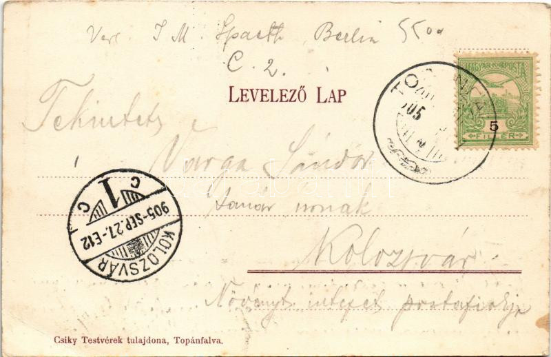 1905 Topánfalva, Topersdorf, Campeni; Schlessel és Walter-féle kastély... https://www.darabanth.com/de/431-Fernauktion/431.0/Ansichtskarten/Siebenburgen~2000005/1905-Topanfalva-Topersdorf-Campeni-Schlessel-es-Walter-fele-kastely-Szalloda-Csiky-Testve~II2773729