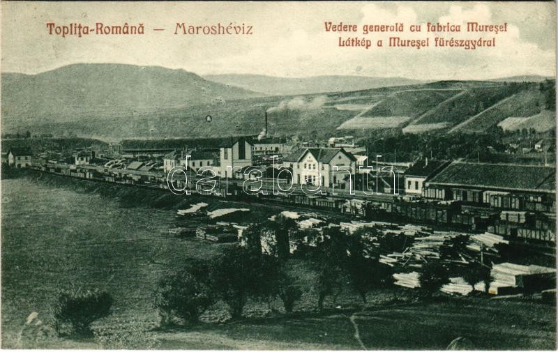 Beschreibung: 1930 Maroshévíz, Oláhtoplica, Toplita, Toplica; látkép, vasútállomás, Muresel fűrészgyár / Fabrica Muresel / sawmill, railway station (EK)