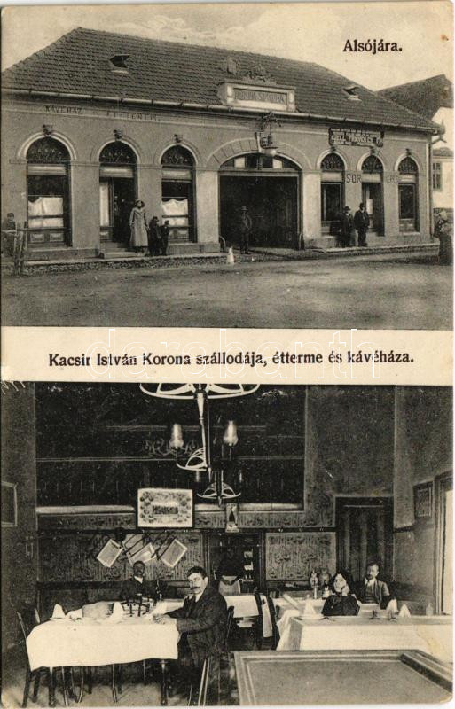 Alsójára, Iara de Jos, Iara; Kacsir István féle Korona szálloda, étterem és kávéház, belső vendégekkel és pincérnővel / hotel, restaurant and café, interior with guests and waitress (r)