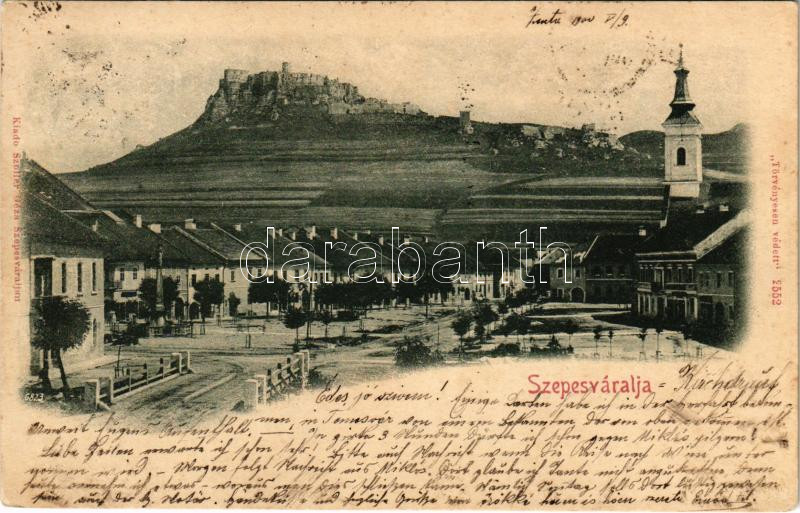 Beschreibung: 1900 Szepesváralja, Kirchdrauf, Spisské Podhradie; Fő tér és Szepes vára. Szoller Géza kiadása / Spissky hrad / Zipser Schloss / castle, main square (EK)