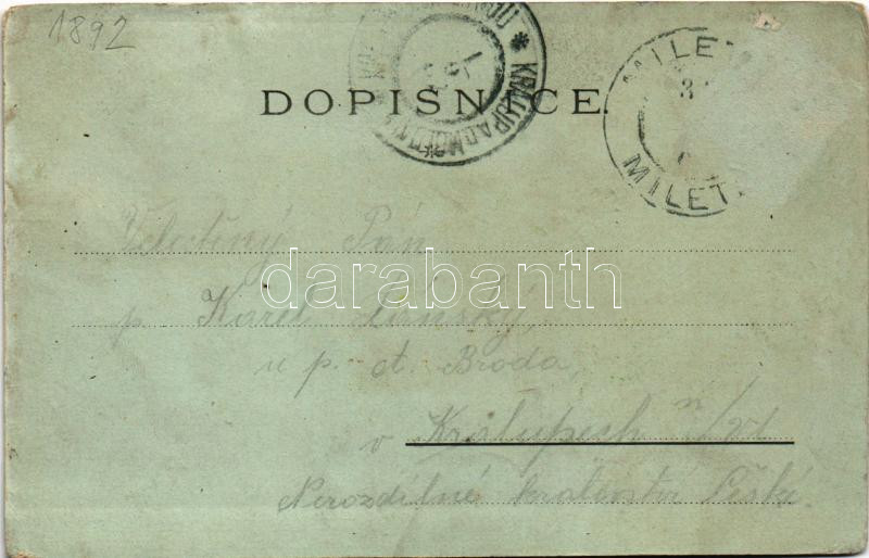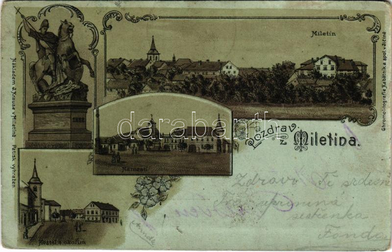 Beschreibung: Miletín, Miletin; Námestí, Kostel s okolim / general view, square, monument, church. Art Nouveau, floral, litho (wet damage)