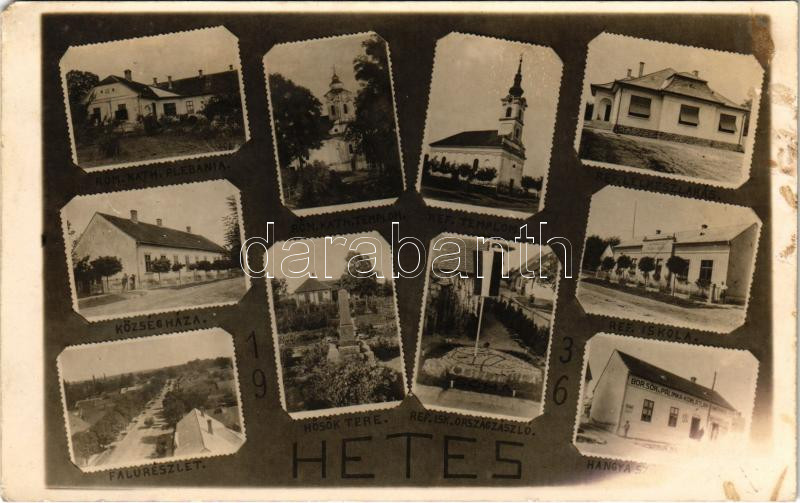 1941 Hetes (Somogy) 1936-ban, Római katolikus templom és plébánia, Református templom, lelkészlakás és iskola, falu részlet, községháza, Hősök tere, Országzászló, Hangya Szövetkezet üzlete. photo (EM)