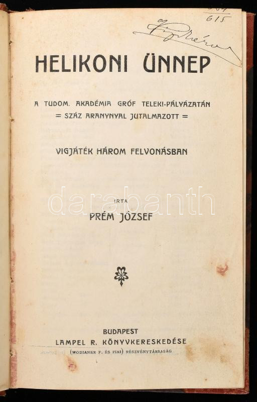 3 db színmáveket, népszínműveket tartalmazó kolligátum Prém József: Helikoni ünnep, Adoprján báró, Sziomahzy: A kegyelmes úr halála és más művek korabeli kissé kopottas félvászon kötésben