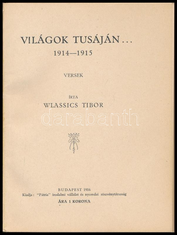 Wlasssics Tibor: Virágok tusáján... 1914-1915. Versek. Bp., 1916., "Pá... https://www.darabanth.com/de/431-Fernauktion/431.0/Bucher/Bucher-Andere-kuriositaten~4000025/Wlasssics-Tibor-Viragok-tusajan-1914-1915-Versek-Bp-1916-Patria-Kiadoi-papirkotC3~II2769144