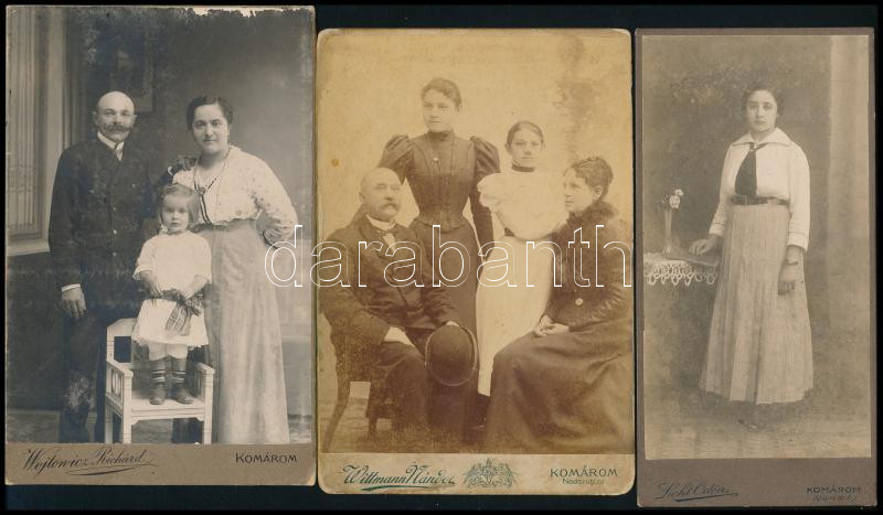 Beschreibung: cca 1910 Családi portrék, 3 db keményhátú fotó komáromi műtermekből, 16,5×8 és 16,5×10 cm