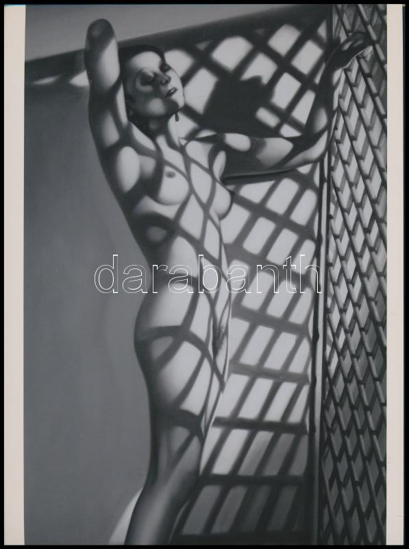 Dora Philippine Kallmus (1881-1953) bécsi fényképész és fotóművész emlékére, 2022-ben fotórealisztikus stílusban, vászonra készült fekete-fehér olajfestmény fotómásolata (akt a rács árnyékában), mai nagyítás, 24x17,7 cm