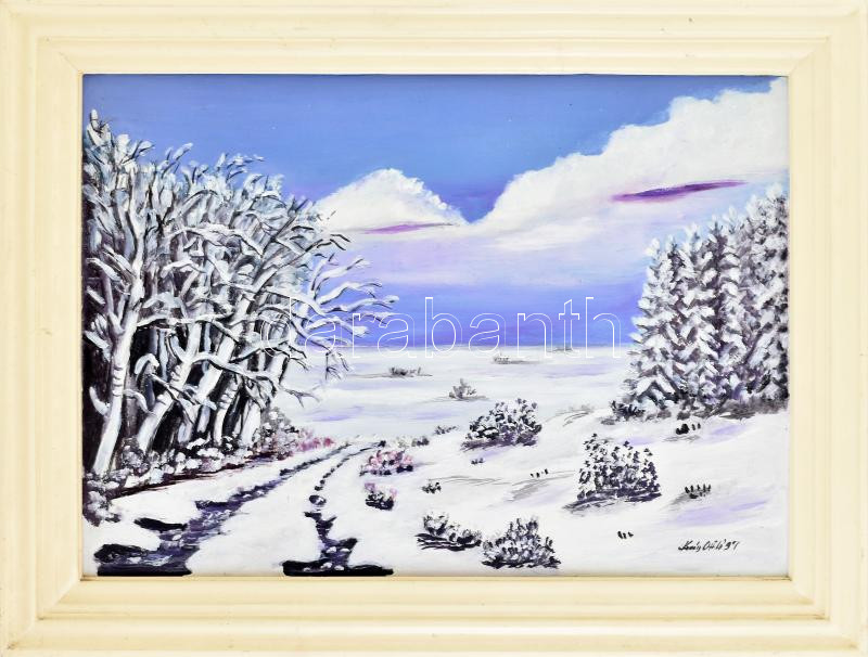 Beschreibung: Olvashatatlan (Király?) jelzéssel: Téli havas táj. Olaj, farost. Fakeretben. 43x60 cm