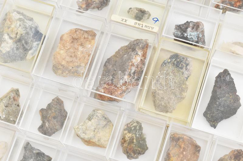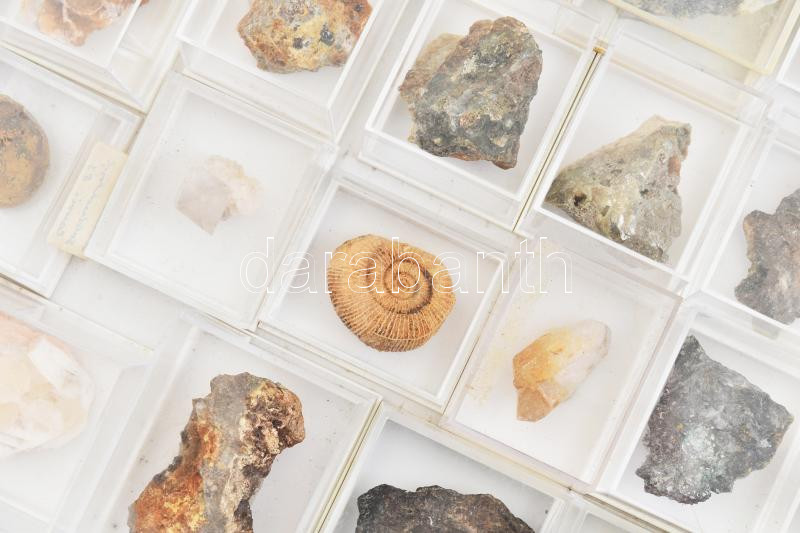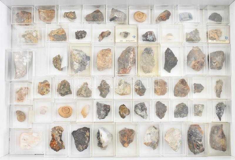 58 darabos vegyes ásvány, fosszília gyűjtemény, szépen egyesével tárolva, nagyrészt feliratozva. (Amoniteszek, kacoxenit, glauberit, stroncianit, Oppelia aspidoides, albit, stb.)