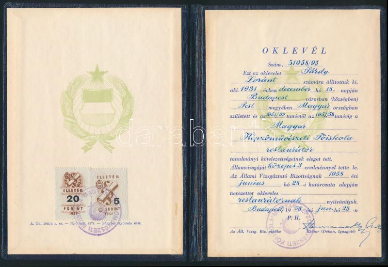 1958 Sárdy Lóránt (1931-2014) festőművész, restaurátor restaurátori di... https://www.darabanth.com/de/431-Fernauktion/431.0/Kunst-Dokumente-andere-Sammelgebiete/Dokument~5000021/1958-Sardy-Lorant-1931-2014-festomuvesz-restaurator-restauratori-diplomaja~II2775515