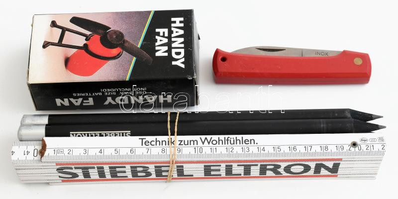 2 m-es zollstock, Inox bicska, elemes ventilátor, 5 db ácsceruza https://www.darabanth.com/de/431-Fernauktion/431.0/Kunst-Dokumente-andere-Sammelgebiete/Flohmarkt~5000015/2-m-es-zollstock-Inox-bicska-elemes-ventilator-5-db-acsceruza~II2774464